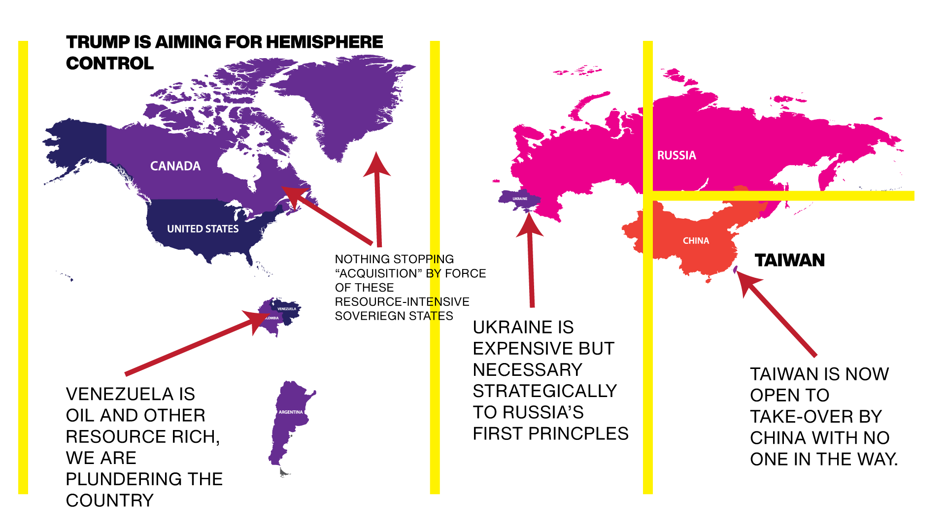 The map below highlights the power structure of 2026. We are inextricably linked now to Venezuela’s fate. Venezuela fuels parts of the South Pacific and Teapot Refineries in China, among other places on the black market. In turn, China has ambitions it can unleash after decades of restraint on Taiwan, which affects everything from the AI bubble to the global consumer television markets – watch that bubble burst! In turn, China is also linked in a two-way relationship with Russia, which is attached to Ukraine and its simultaneous ambition and necessity of ending the war there to expand its extractive, oligarchic-building machine. All of it ties back to us, right here in the United States.